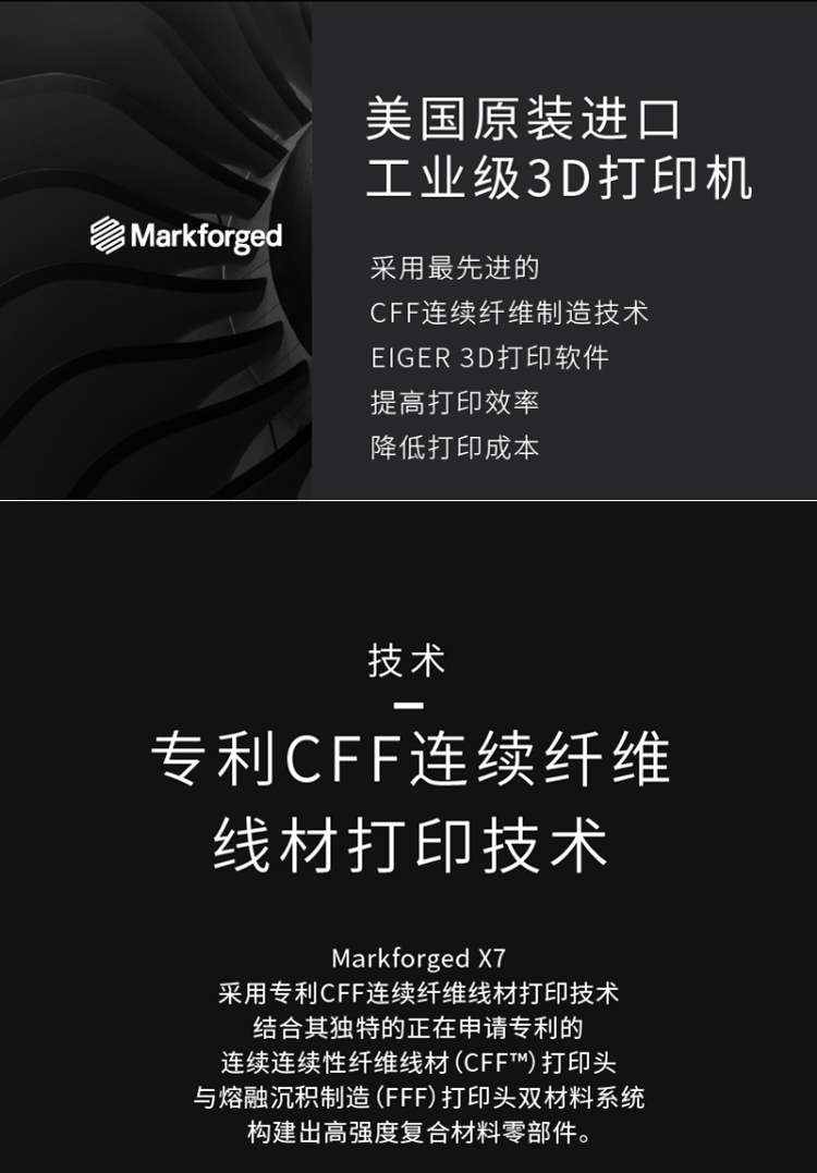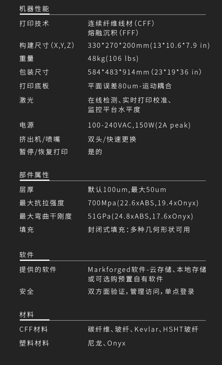 Markforged X7是一款基于復(fù)合材料的3D打印機(jī),它采用了Markforged自主研發(fā)的獨(dú)特技術(shù),可以在同一設(shè)備上打印出強(qiáng)度高、精度高、耐熱、耐腐蝕等性能優(yōu)異的零部件。它是一款專業(yè)級(jí)3D打印機(jī),主要應(yīng)用于航空航天、汽車、醫(yī)療器械等領(lǐng)域。Markforged X7的打印材料主要包括了碳纖維、玻璃纖維、金屬、Kevlar等多種材料,這些材料都具有高強(qiáng)度、高剛度、高耐熱、高耐腐蝕等特點(diǎn),可以滿足不同行業(yè)的需求。此外,該打印機(jī)還支持金屬增強(qiáng)復(fù)合材料打印,可以打印出具有金屬質(zhì)感的零部件,增加了產(chǎn)品的美觀性和實(shí)用性。Markforged X7采用了全新的雙頭打印技術(shù),可以同時(shí)打印出纖維增強(qiáng)和金屬材料,實(shí)現(xiàn)了更高的打印速度和更廣泛的應(yīng)用范圍。同時(shí),該打印機(jī)還配備了自動(dòng)校準(zhǔn)和自動(dòng)切換打印頭等功能,可以大大提高打印效率和穩(wěn)定性。Markforged X7還支持云端管理和遠(yuǎn)程監(jiān)控,可以隨時(shí)隨地掌握打印進(jìn)度和狀態(tài),大大方便了用戶的使用和維護(hù)。該打印機(jī)還具有高度的可定制性,用戶可以根據(jù)自己的需求進(jìn)行定制,實(shí)現(xiàn)個(gè)性化的打印需求。Markforged X7是一款功能強(qiáng)大、性能優(yōu)異的3D打印機(jī),具有高度的可定制性和適用性,可以滿足不同行業(yè)的需求,為用戶提供高效、精準(zhǔn)的打印解決方案。